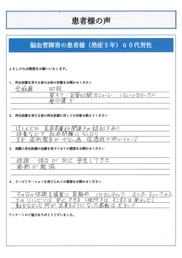 1年前までは自分の意思で全く身体を動かすことが出来なかった寝たきりの状態から、少しづつ「自分の意思で動かす」ことが出来るようになり、 そしてまだ補助は必要ですが、座ったり、立ち上がれるようになってきました。 自分の意思で身体を動かそうとして、1ミリでも動くというのは、これまでの状態から考えると相当の回復だと実感しています。治療を行った結果、「主人の細胞がどんどん活性化している」と私は思っています。