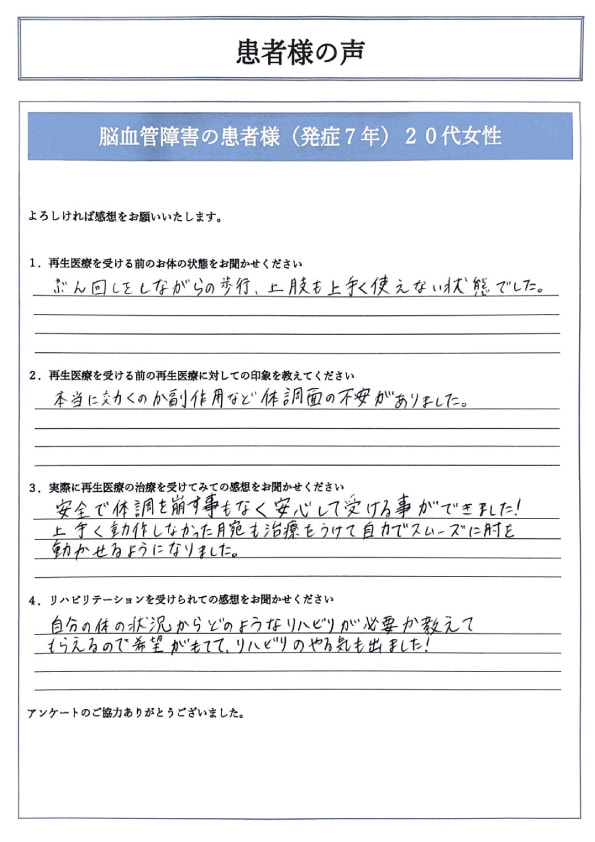 リハビリは、ボバース、川平法、ロボットリハビリなどいくつものリハビリを経験し3年程経った時から 体の変化を全く感じなくなりました。